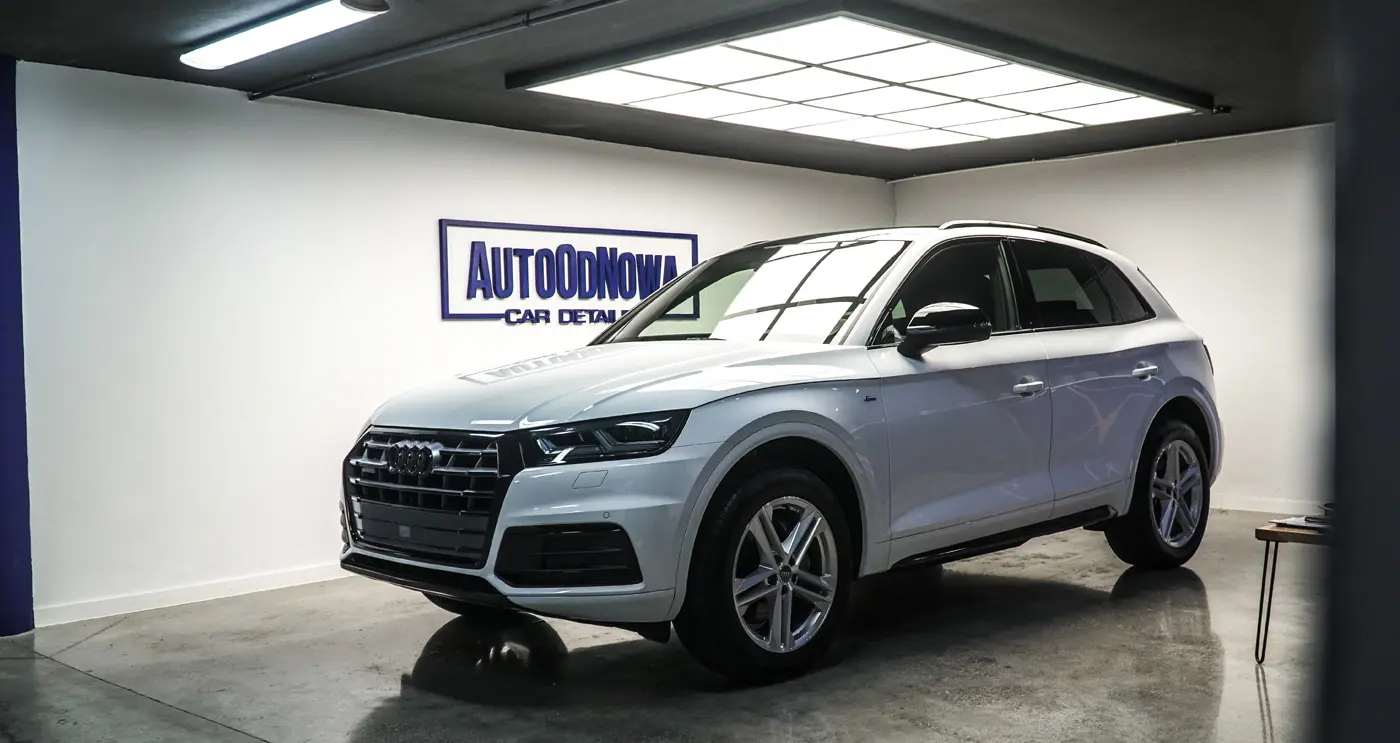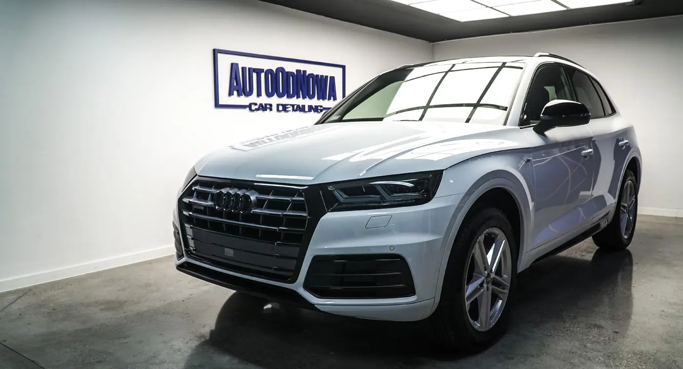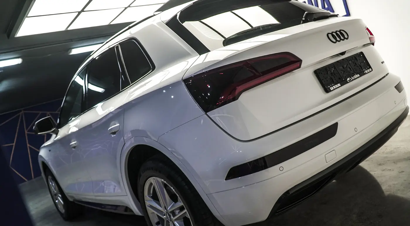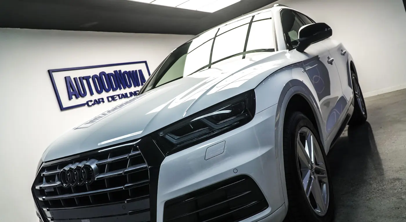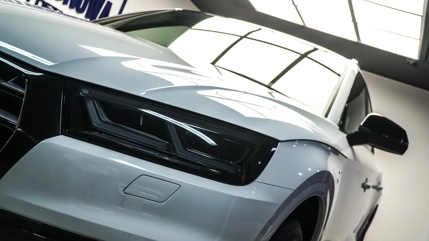 Auto było już używane dłuższy czas więc lakier wymagał korekty od której zaczęliśmy listę naszych prac. Kolejnym zadaniem był dechroming wszystkich elementów chromowanych tj. grill, listwy i znaczki Audi, które zostały oklejone na czarno. Lampy przód i tył, lusterka tak samo jak dach przyciemniliśmy folią ochronną od Clif Designs Polska. A następnie całość oblaliśmy “szkiełkiem” od Fireball Polska. Audi Q5 zmieniło się nie do poznania! Efekt jest niesamowity, co było widać po minach naszych klientów
