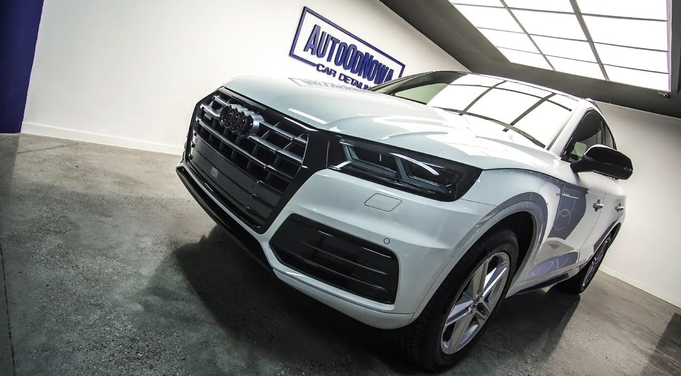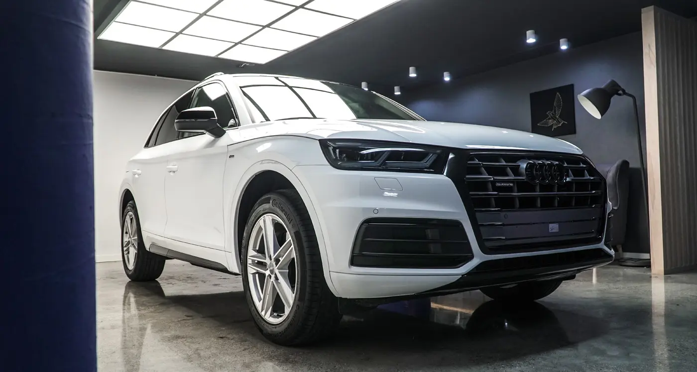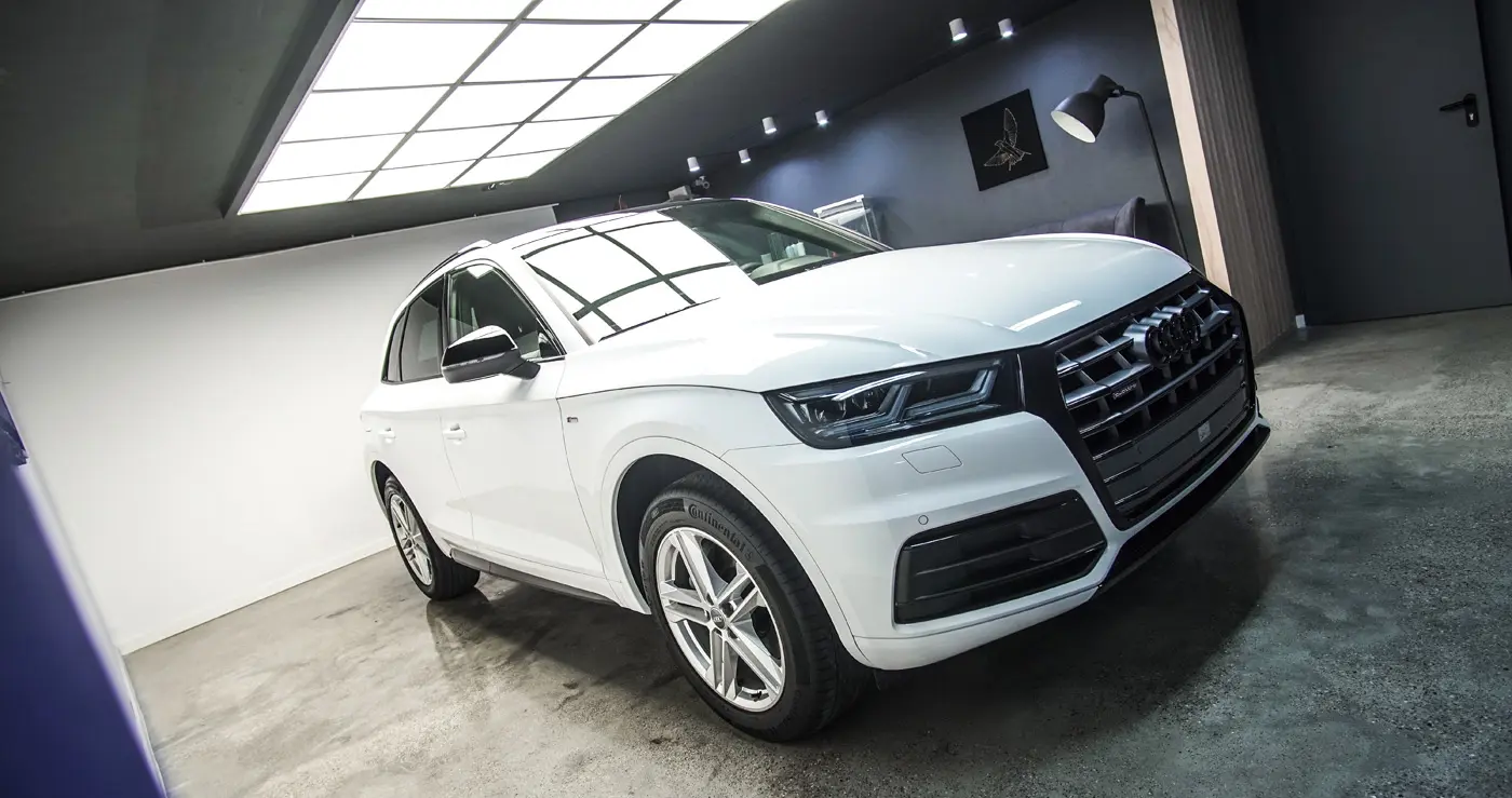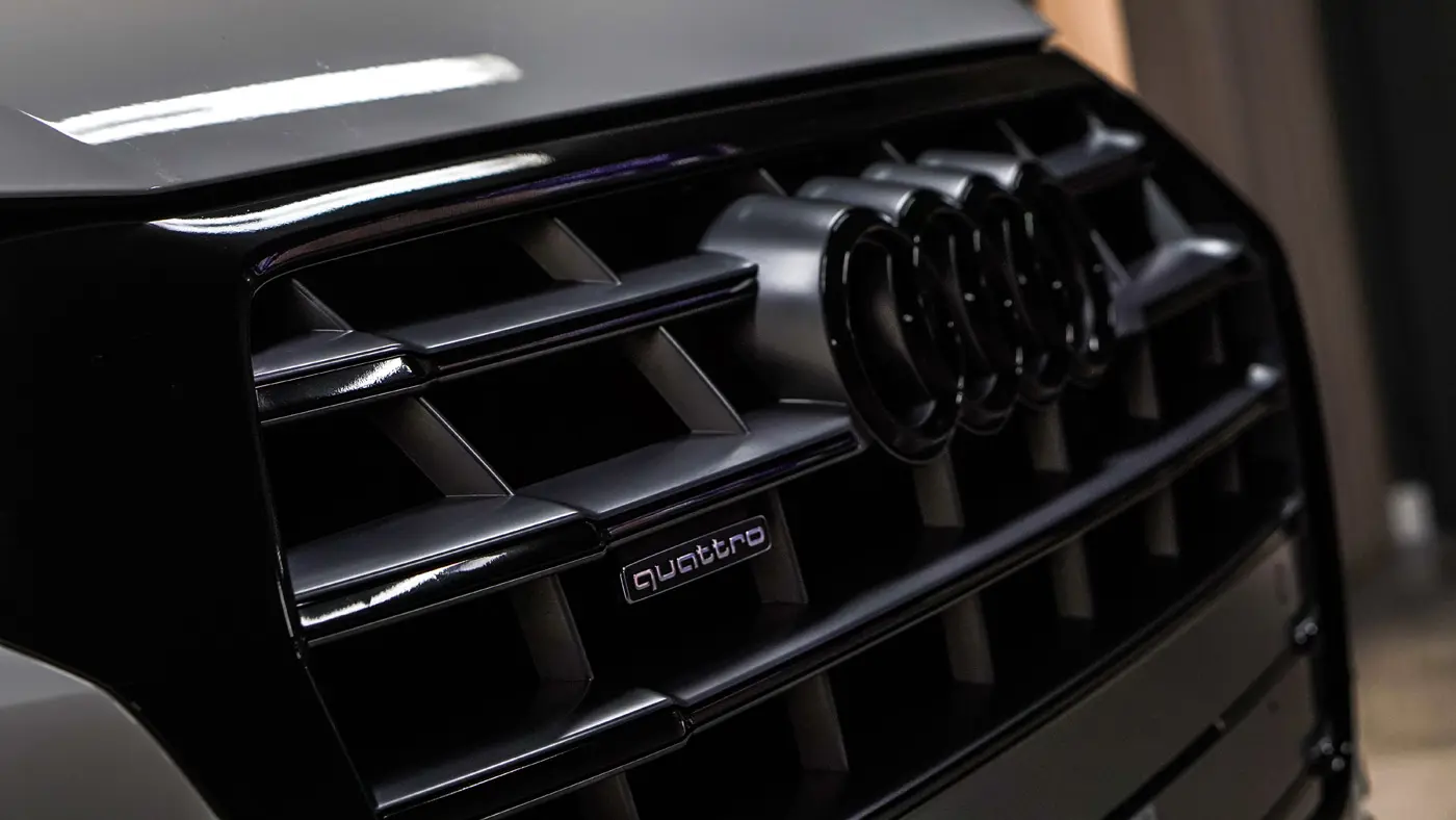 Auto było już używane dłuższy czas więc lakier wymagał korekty od której zaczęliśmy listę naszych prac. Kolejnym zadaniem był dechroming wszystkich elementów chromowanych tj. grill, listwy i znaczki Audi, które zostały oklejone na czarno. Lampy przód i tył, lusterka tak samo jak dach przyciemniliśmy folią ochronną od Clif Designs Polska. A następnie całość oblaliśmy “szkiełkiem” od Fireball Polska. Audi Q5 zmieniło się nie do poznania! Efekt jest niesamowity, co było widać po minach naszych klientów