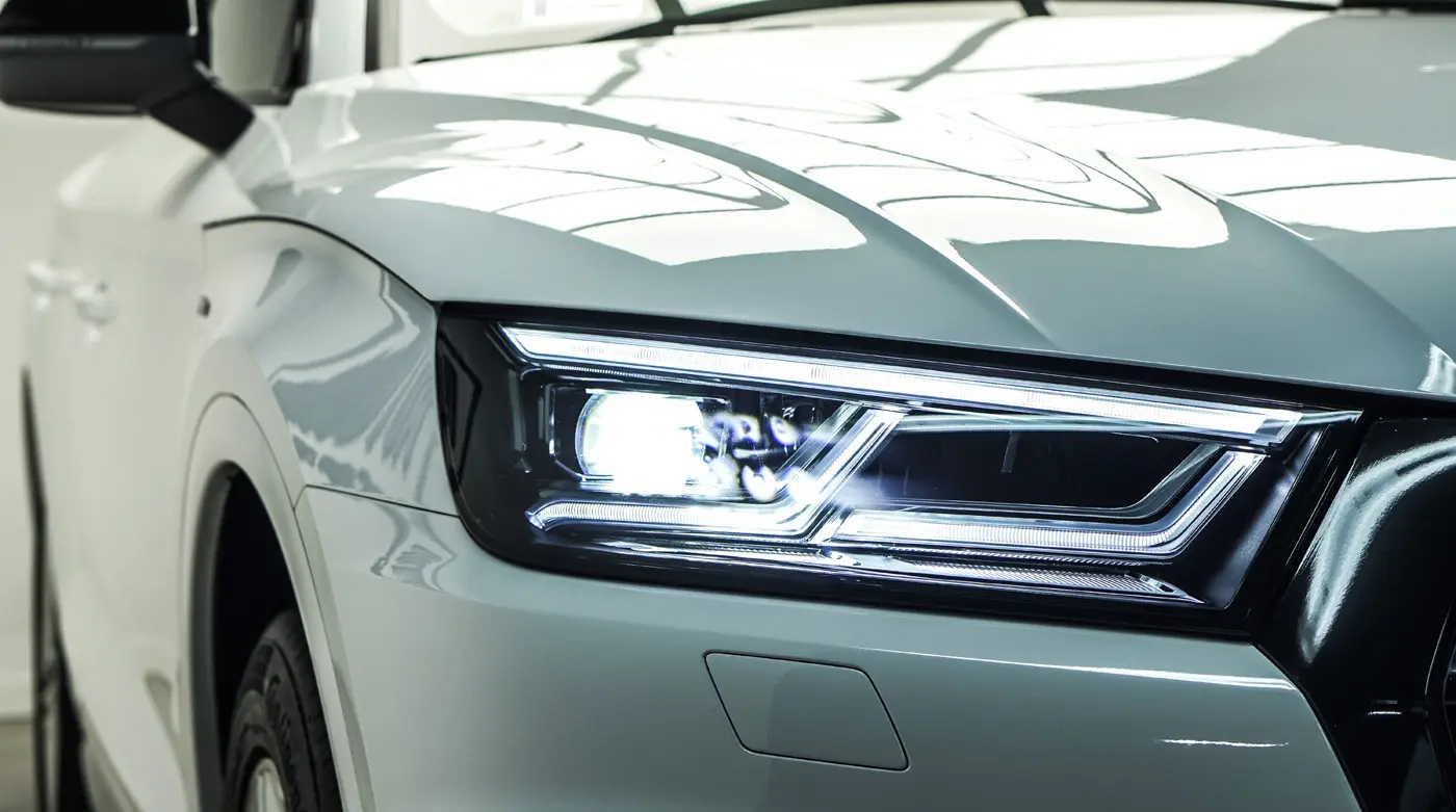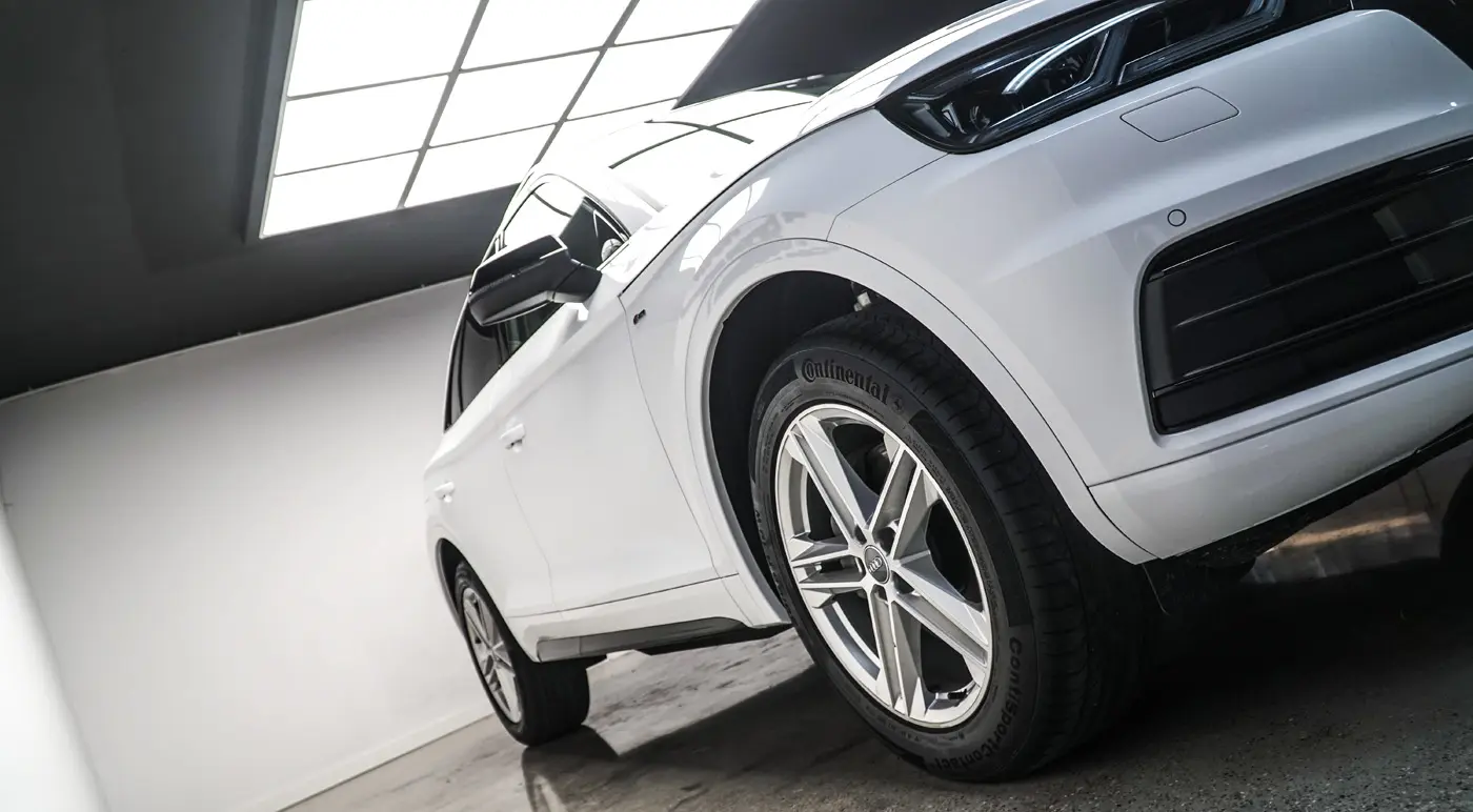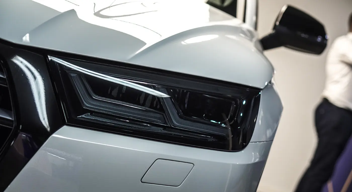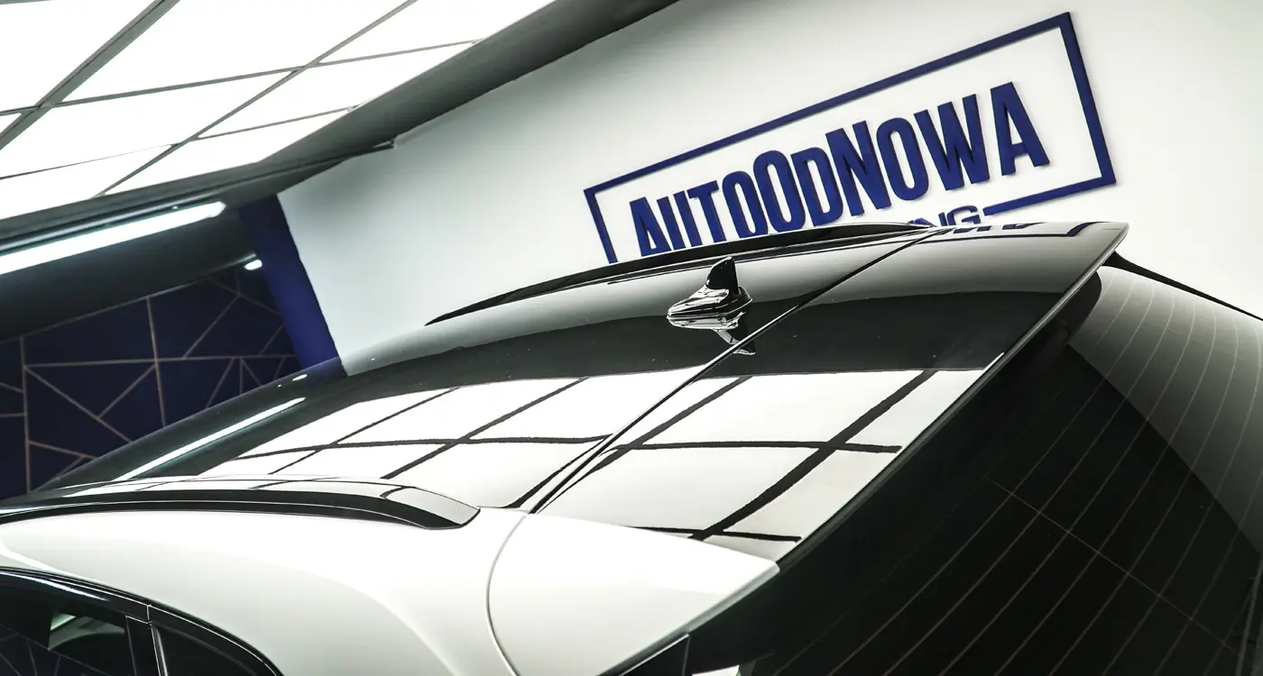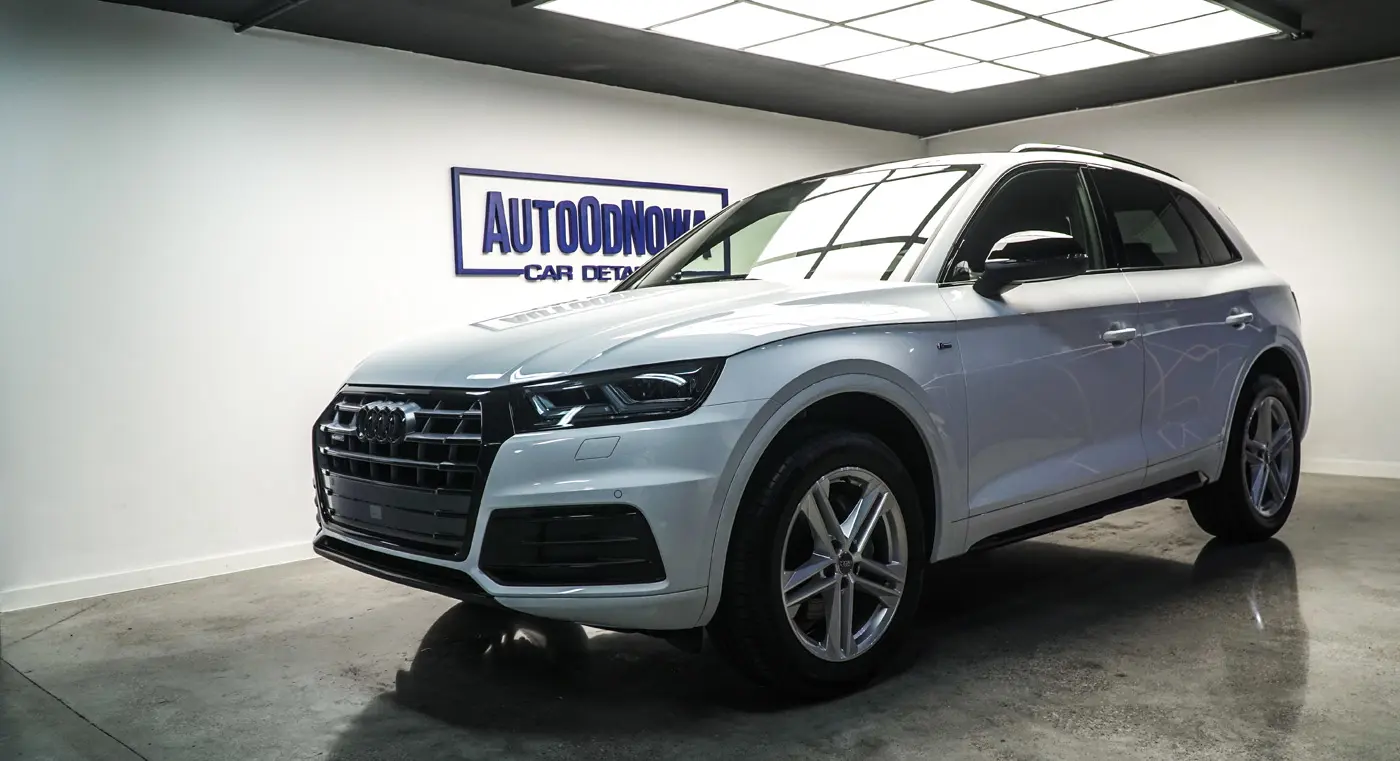 Auto było już używane dłuższy czas więc lakier wymagał korekty od której zaczęliśmy listę naszych prac. Kolejnym zadaniem był dechroming wszystkich elementów chromowanych tj. grill, listwy i znaczki Audi, które zostały oklejone na czarno. Lampy przód i tył, lusterka tak samo jak dach przyciemniliśmy folią ochronną od Clif Designs Polska. A następnie całość oblaliśmy “szkiełkiem” od Fireball Polska. Audi Q5 zmieniło się nie do poznania! Efekt jest niesamowity, co było widać po minach naszych klientów